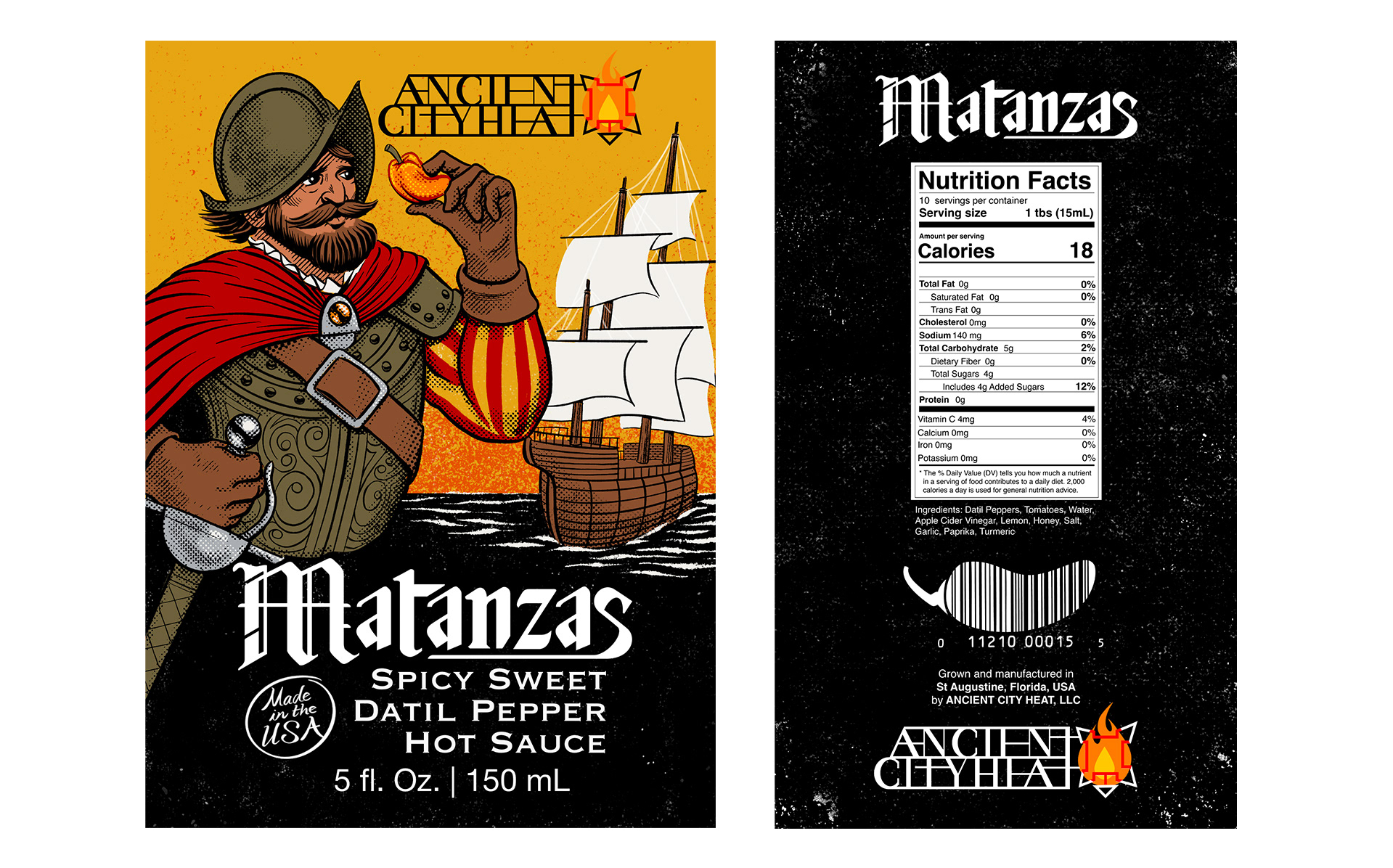 The front and back labels for Ancient City Heat's Matanzas Spicy Sweet Datil Peper Hot Sauce.